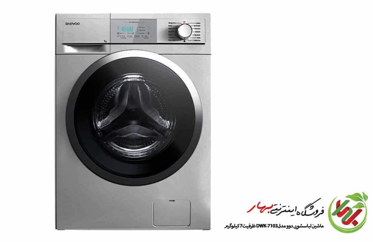ماشین لباسشویی دوو مدل DWK-7103 ساخت کشور ایران می‌باشد. آیا می‌دانستید؟ این روزها با وجود ماشین لباسشویی زندگی بسیار راحت‌تر از پیش شده است و دیگر نیازی نیست برای شستشوی لباس‌ها به زحمت بی‌افتید! شما با وجود این دستگاه تنها می‌توانید با فشار دادن چند دکمه یا صفحه نمایشگر لمسی لباس‌های کثیف خود را به لباس‌هایی تمیز و پاکیزه تبدیل کنید و آن را نسبتاً خشک تحویل بگیرید. ما در این نوشتار از خود قصد داریم شما را با یکی از ماشین لباسشویی‌های کاربردی هرچه بهتر و بیشتر آشنا نماییم. لطفاً با فروشگاه اینترنتی بهار در امتداد این مطلب همراه باشید.